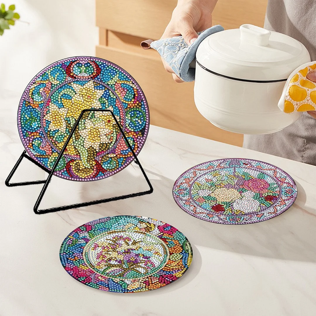 5.Convenient Storage and Beautiful Decor: With the included storage rack, these diamond painted kitchen dish mats can be neatly organized and displayed when not in use. They not only serve as functional coasters but also enhance the aesthetics of your home decor. The festive atmosphere makes them an excellent choice as Christmas gifts. They are also a great addition to BBQ parties and weddings, making them a versatile and perfect gift for any occasion.