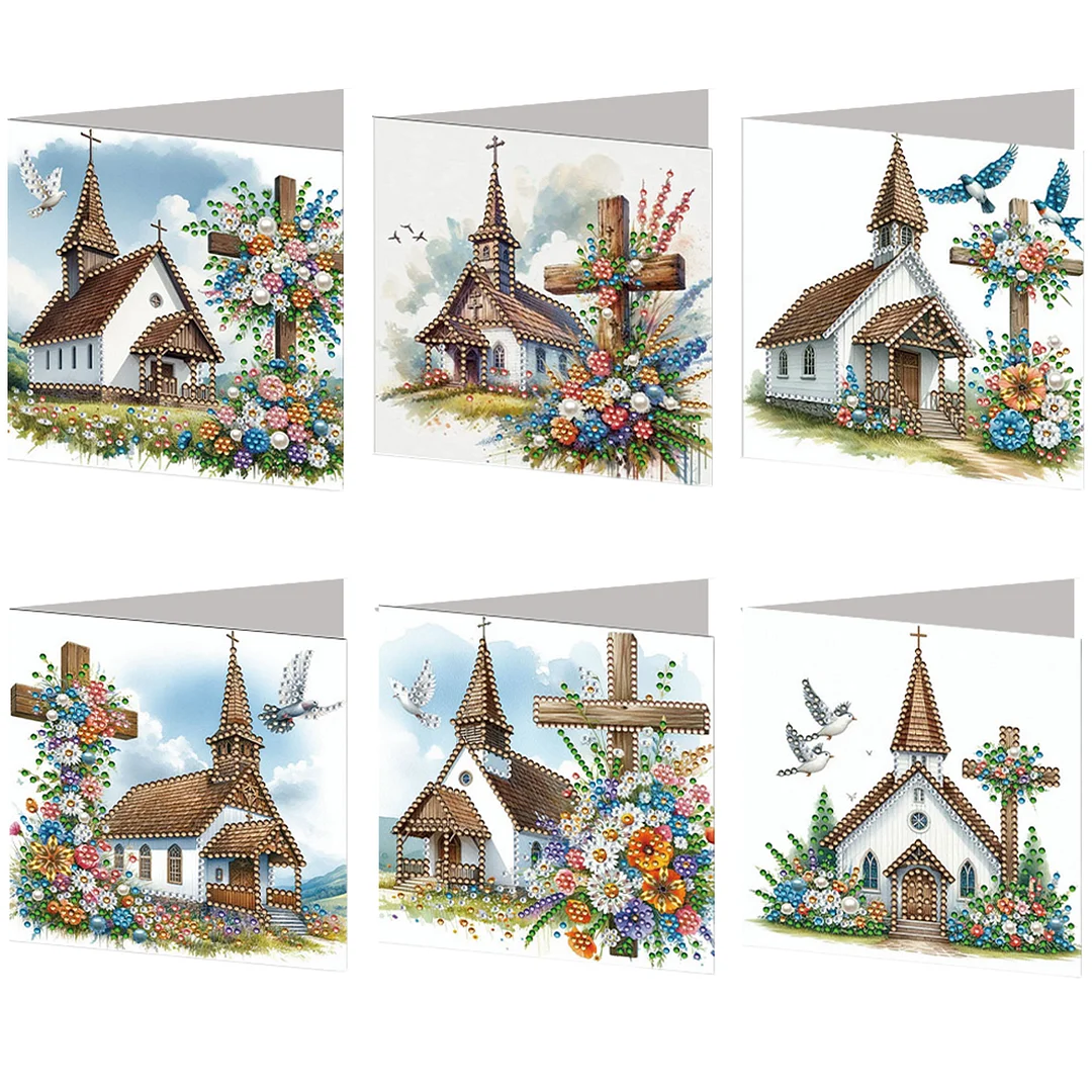 6pcs Diamond Painting Cross Church Greeting Card Set with Envelope Daily Wishing Cards for Birthdays Thanksgiving & Special Occasion