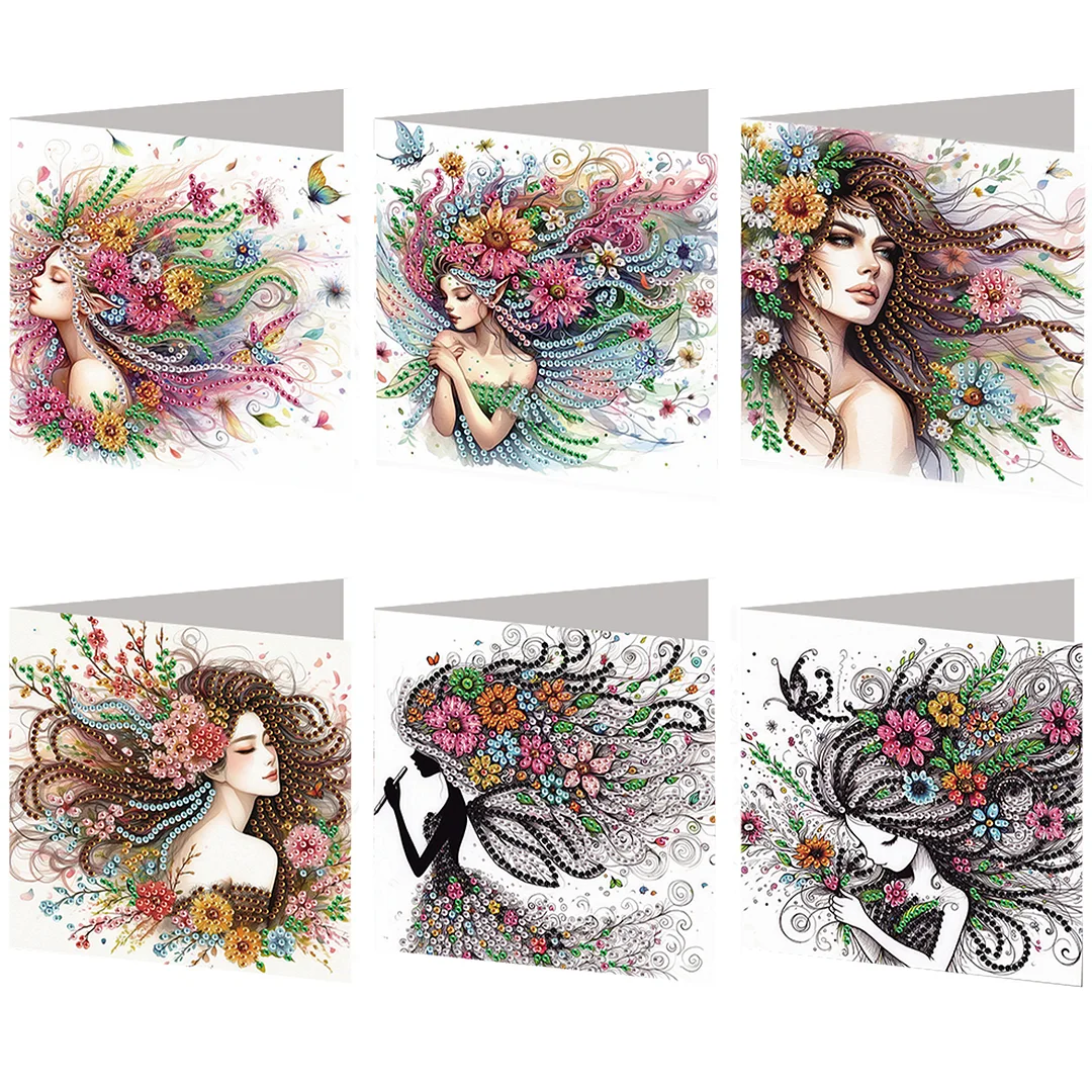 6PCS Diamond Painting Girl Greeting Cards Postcards with Envelopes
