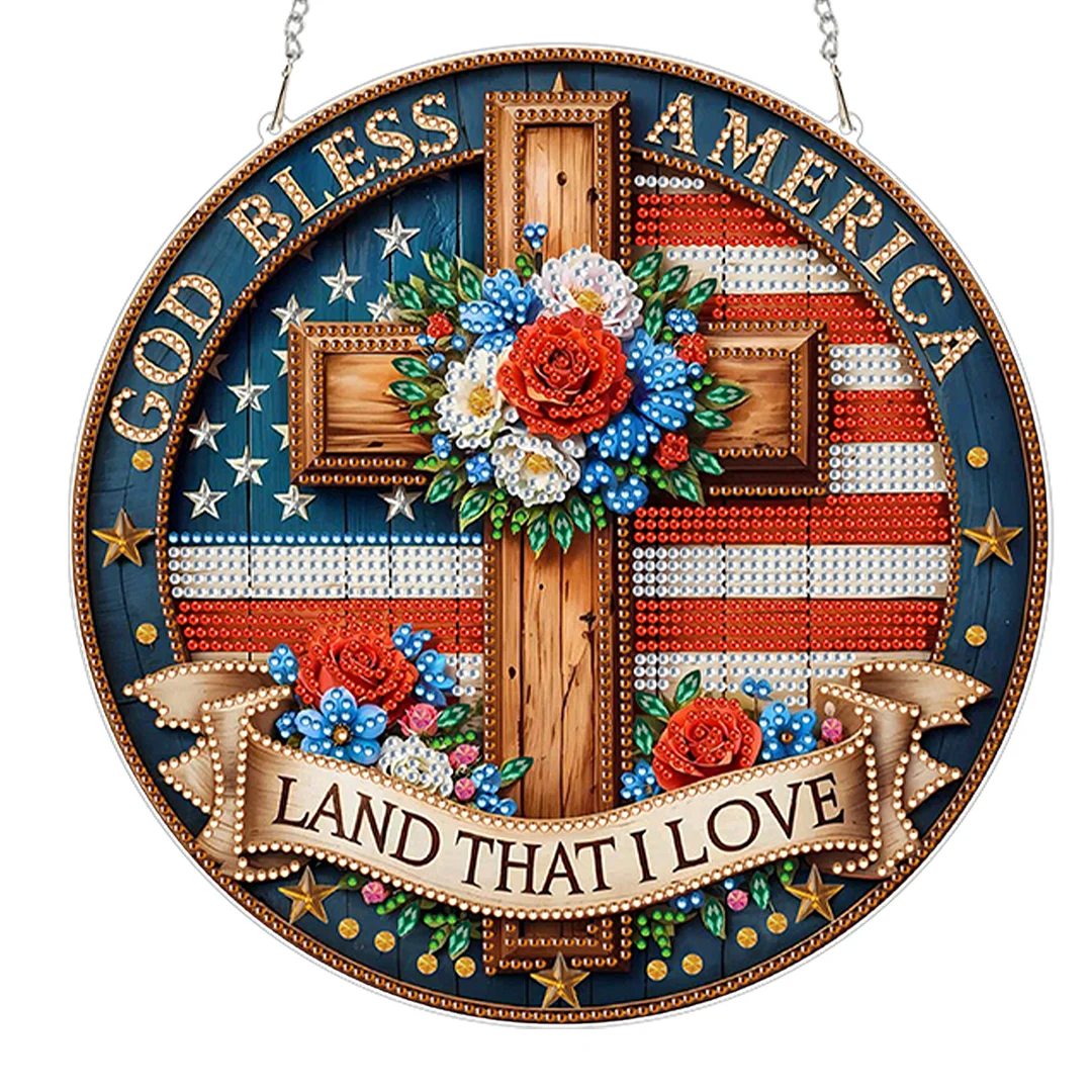 Diamond Painting Single-Sided Acrylic God Bless America - Cross Hanging Pendant Sun Catcher for Home Garden Wall Door
